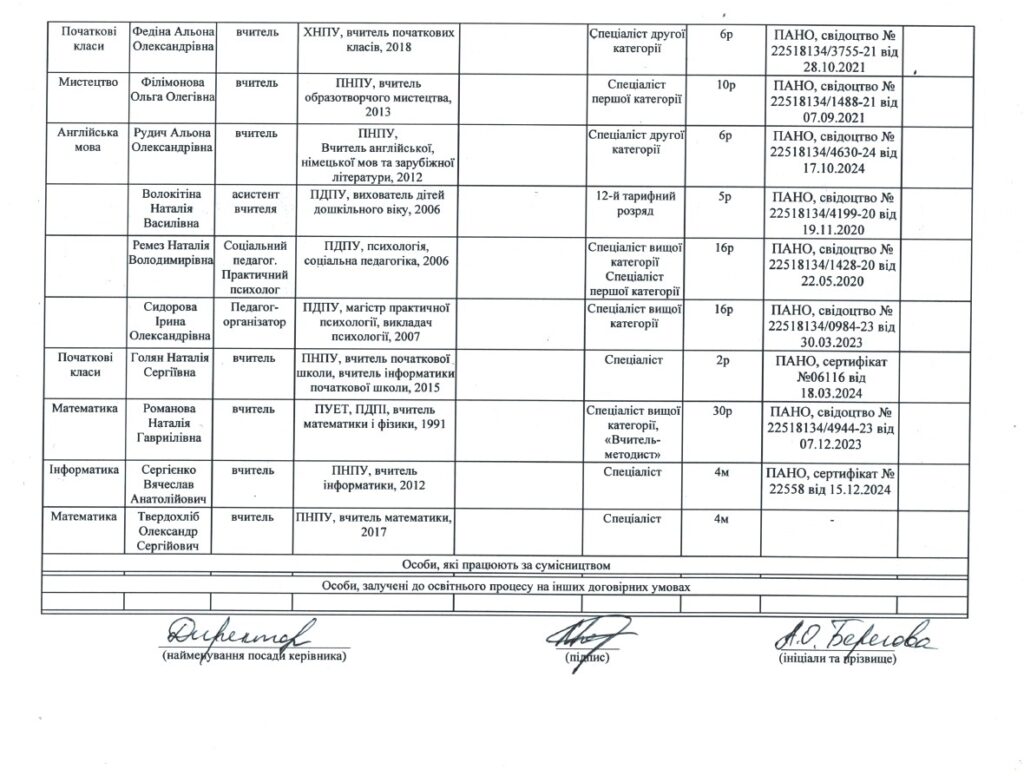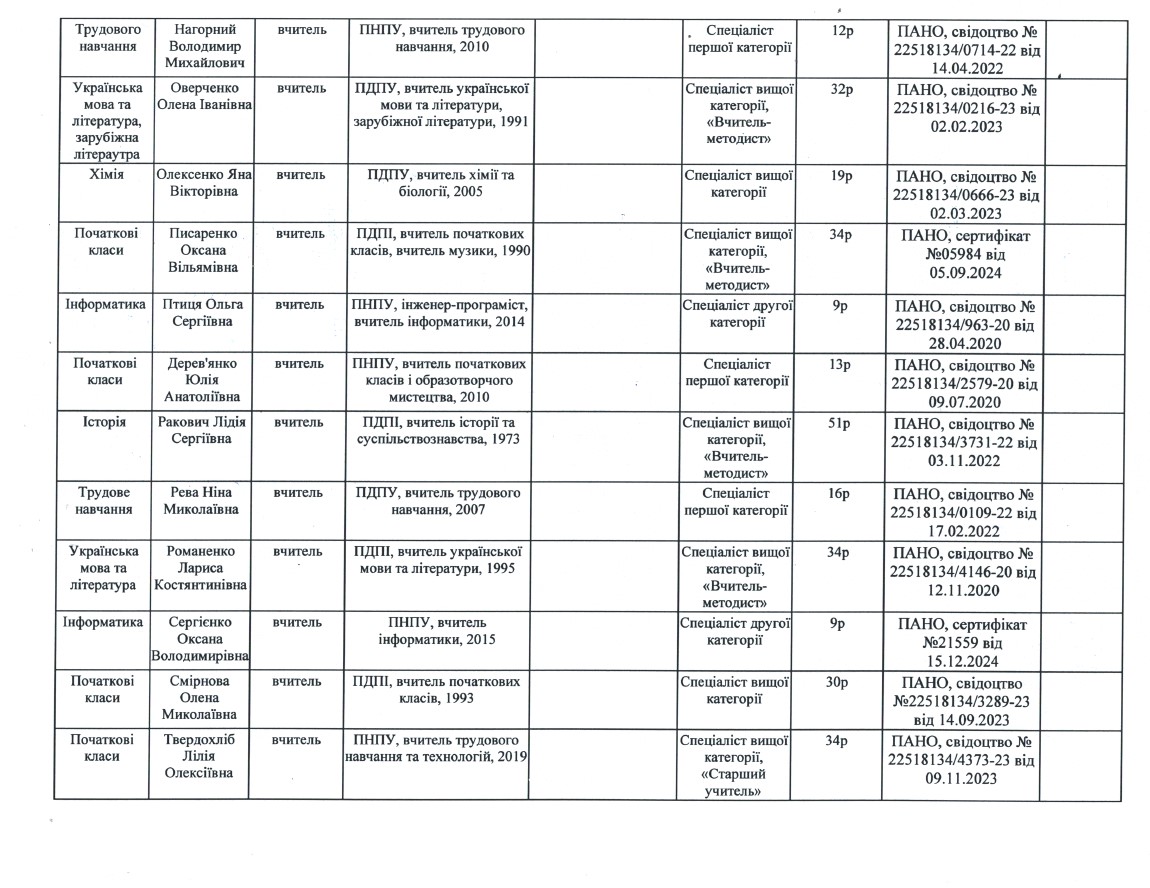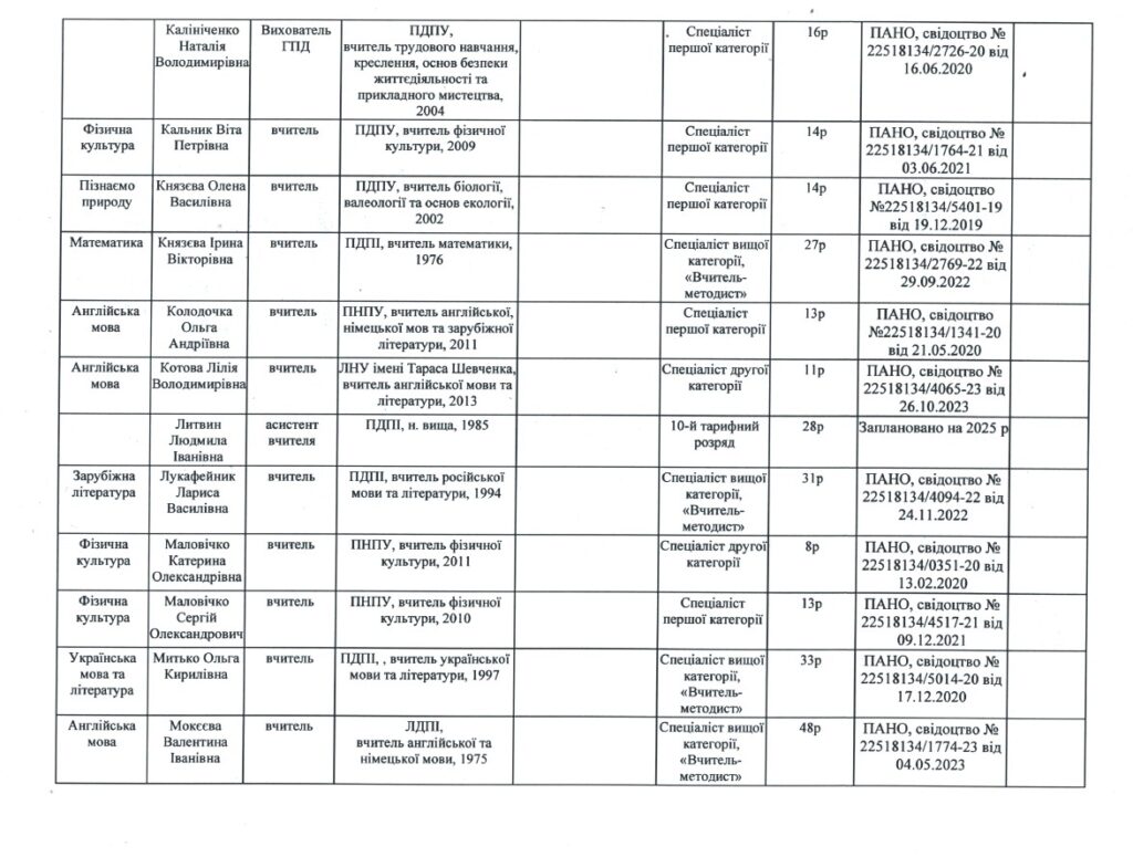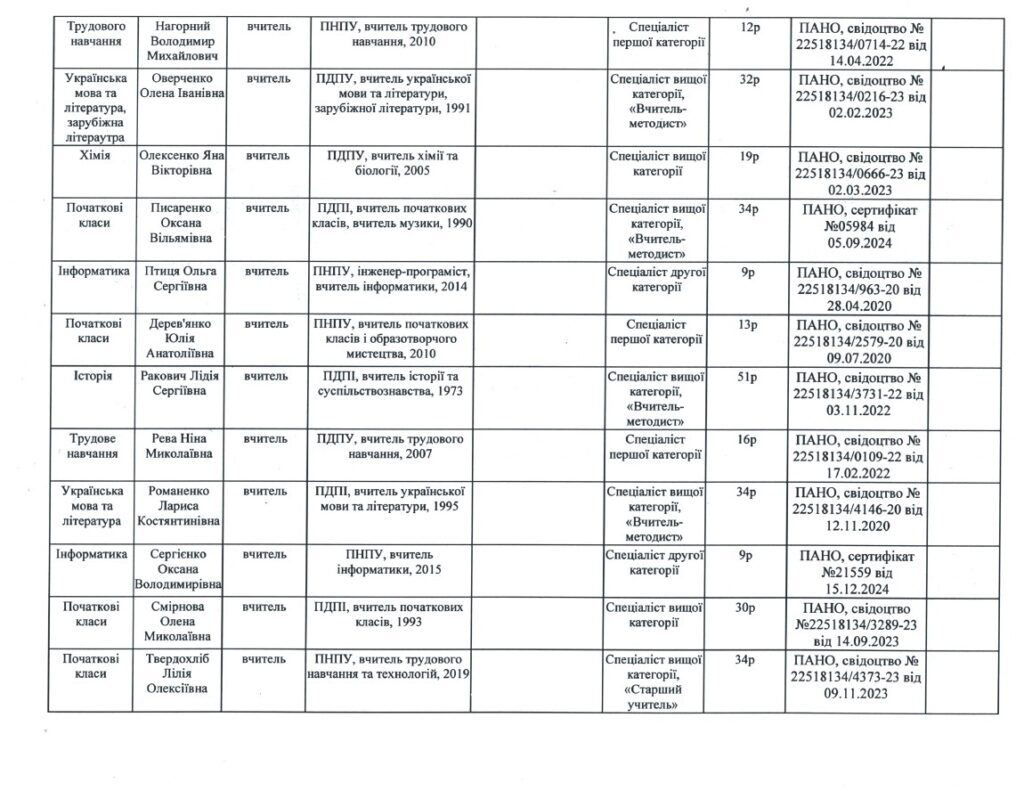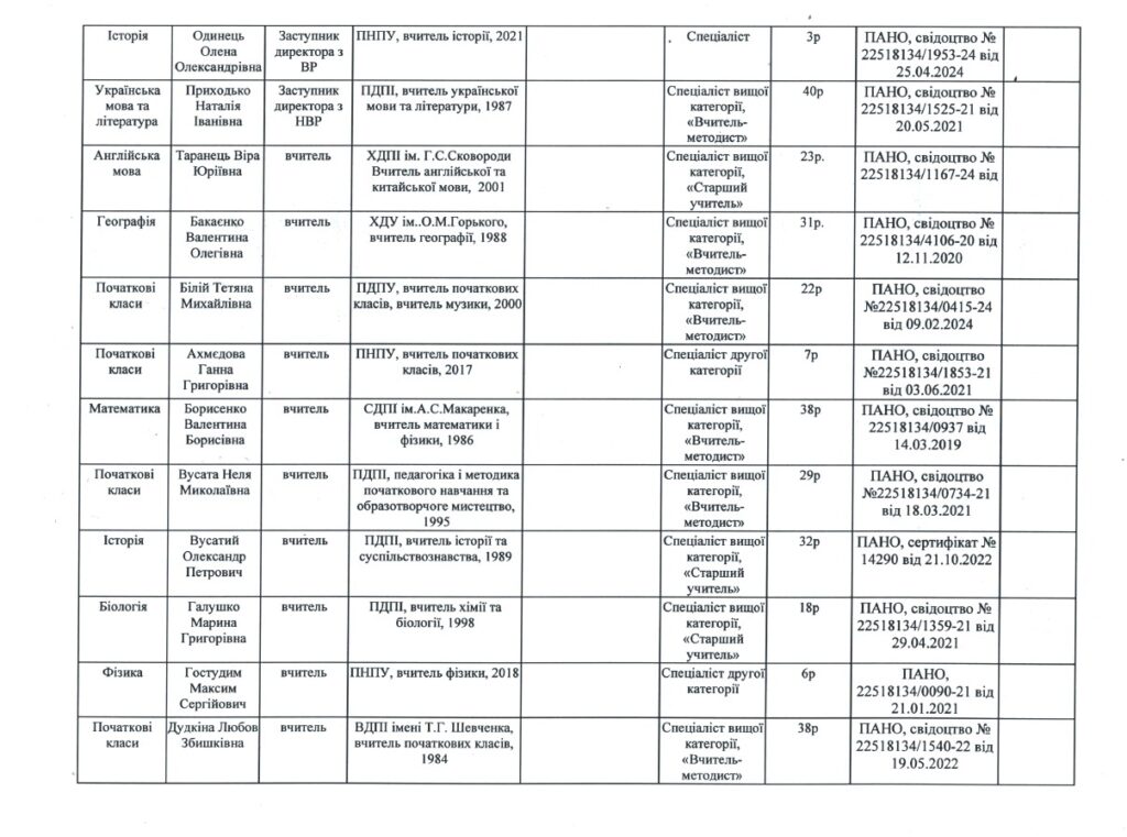1. Інформація про відповідність освіти та/або кваліфікації педагогічних працівників, інших фізичних осіб, які мають право провадити педагогічну діяльність на рівні загальної середньої освіти і залучені до освітнього процесу, обов’язковим до вивчення навчальним предметам, які вони викладають