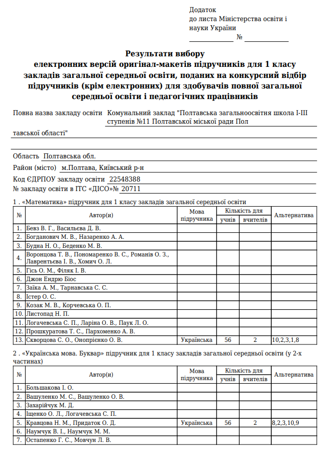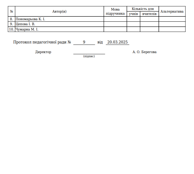 - Витяг з протоколу №9 від 20.03.2025 засідання педагогічної ради про замовлення підручників для учнів 1-х класів
